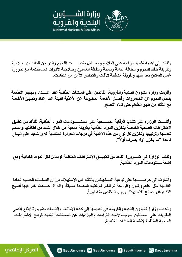 وزارة الشؤون البلدية والقروية On Twitter وزارة الشؤون البلدية والقروية توجه الأمانات بتكثيف أعمال الرقابة الصحية على المنشآت الغذائية للحفاظ على صحة وسلامة المستهلكين Https T Co Ijnm7aew0m